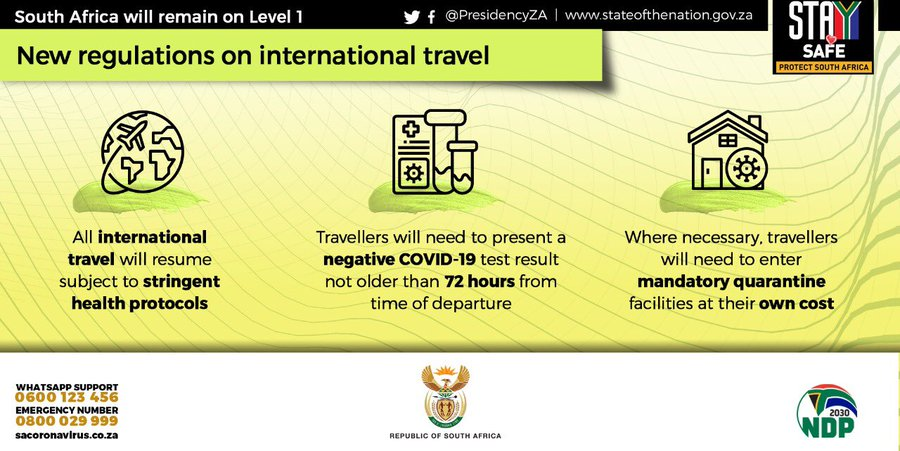 We will be allowing travel into and out of south africa for business, leisure and other travel with effect from 1 october 2020.